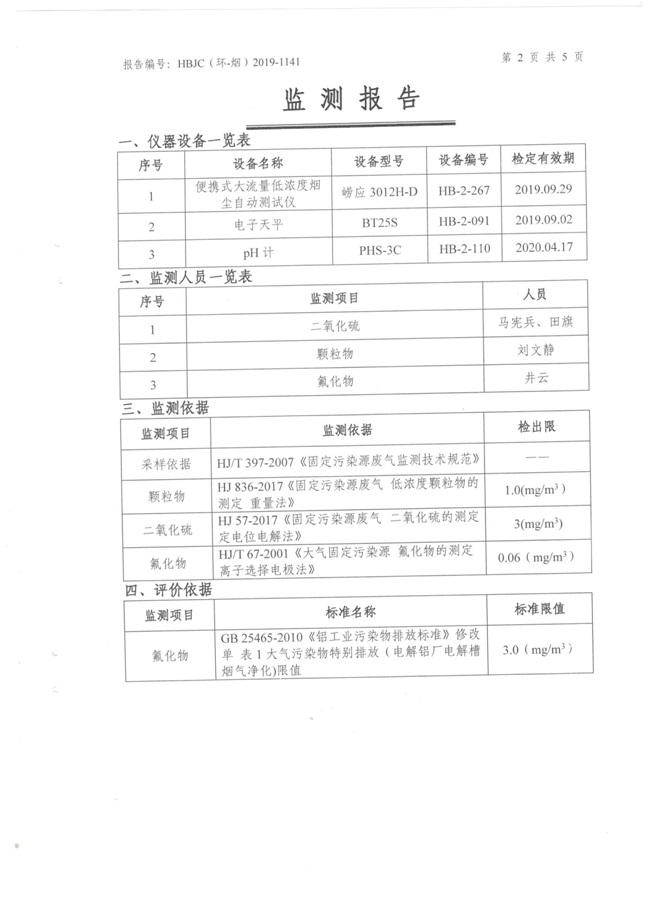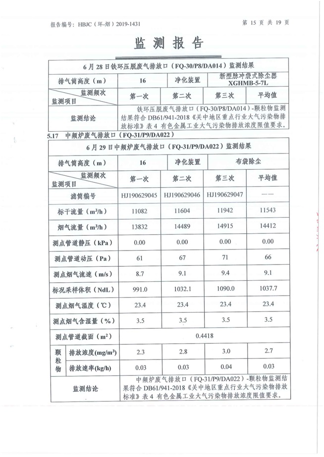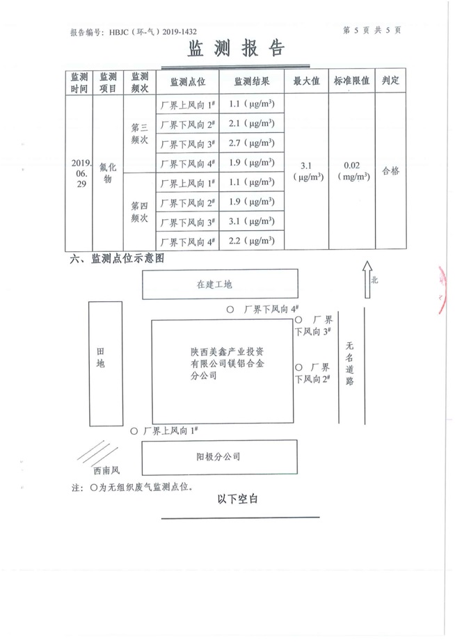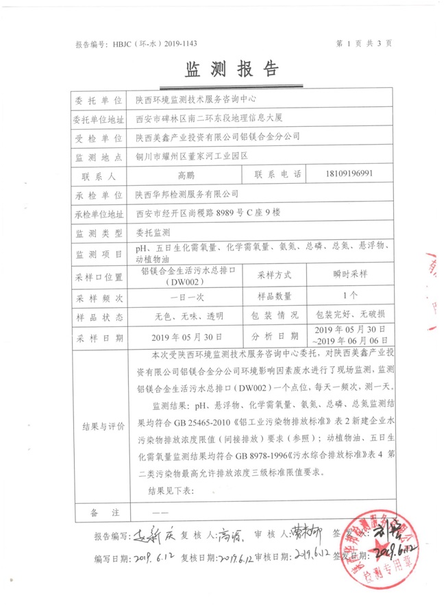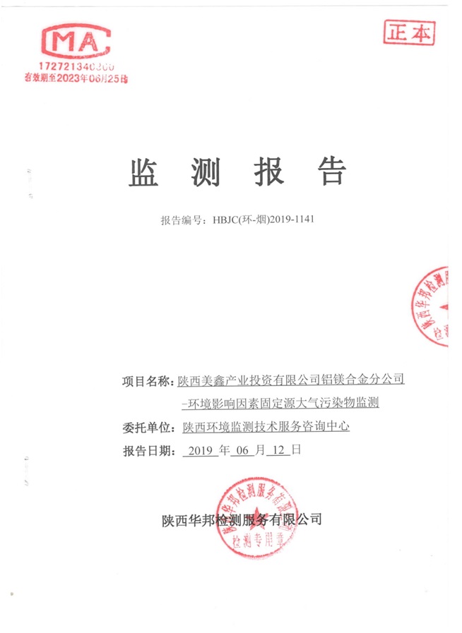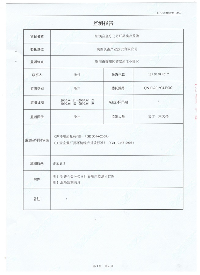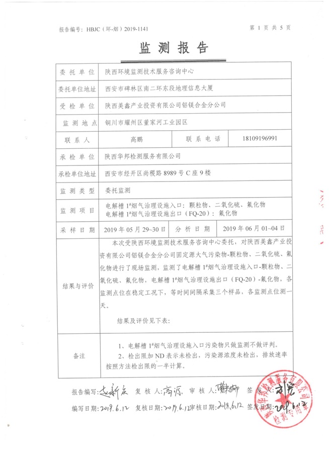 一、基礎(chǔ)信息: 陜西美鑫產(chǎn)業(yè)投資有限公司 統(tǒng)一社會(huì)信用代碼:91610200567136996Y 法定代表人:高曉兵 生產(chǎn)地址:陜西省銅川市董家河工業(yè)園區(qū) 聯(lián)系方式:09196982605 生產(chǎn)經(jīng)營和管理服務(wù)的主要內(nèi)容、產(chǎn)品及規(guī)模: 美鑫公司在陜西有色、陜西煤化兩大集團(tuán)的正確領(lǐng)導(dǎo)下,在銅川市委、市政府的關(guān)心支持下,充分利用銅川資源型城市轉(zhuǎn)型政策,依托園區(qū)區(qū)位優(yōu)勢,擬投資150億元,建設(shè)年產(chǎn)30萬噸預(yù)焙陽極、120萬噸煤礦、30萬噸鋁鎂合金及配套動(dòng)力站、20萬噸鋁深加工、年吞吐量500—800萬噸物流園等循環(huán)經(jīng)濟(jì)項(xiàng)目。該集群項(xiàng)目已被列入《陜西省國民經(jīng)濟(jì)和社會(huì)發(fā)展第十二個(gè)五年規(guī)劃綱要》,為陜西省“58123”項(xiàng)目之一。美鑫公司以循環(huán)經(jīng)濟(jì)為路徑,堅(jiān)持經(jīng)濟(jì)增長與環(huán)境保護(hù)協(xié)調(diào)發(fā)展,聚合資源與資本,走綠色發(fā)展、清潔發(fā)展、低碳發(fā)展的循環(huán)經(jīng)濟(jì)轉(zhuǎn)型升級之路。 陜西美鑫鋁鎂合金分公司采用的500kA預(yù)焙陽極電解槽,自動(dòng)化程度高,電解槽打殼、加料全過程均由微機(jī)自動(dòng)控制,從而使槽罩開啟次數(shù)顯著降低,電解槽集氣效率能夠達(dá)到99%,大大地減少了煙氣無組織排放。項(xiàng)目配置了2套電解煙氣凈化系統(tǒng),經(jīng)捕集的煙氣通過排煙支管進(jìn)入排煙總管,采用電解鋁生產(chǎn)原料—氧化鋁吸附阻濾煙氣中的氟化氫氣體及含氟煙塵,吸附后的載負(fù)氧化鋁進(jìn)入袋式除塵器,經(jīng)氣固分離后進(jìn)入石灰石—石膏脫硫系統(tǒng)脫硫。 陜西美鑫產(chǎn)業(yè)投資有限公司鋁鎂合金分公司2019年2季度自行監(jiān)測如下: 二、監(jiān)測方案: 1 大氣污染源監(jiān)測