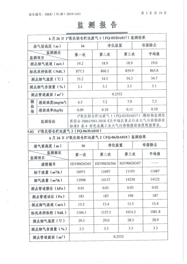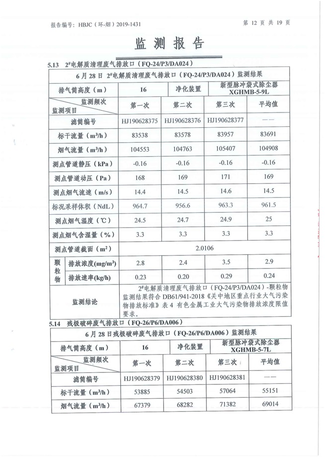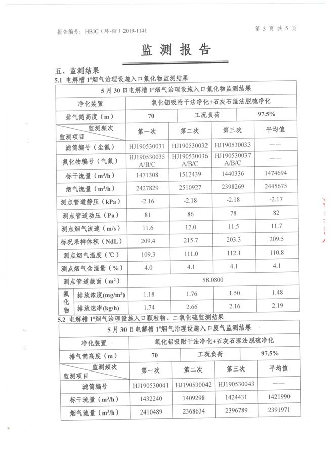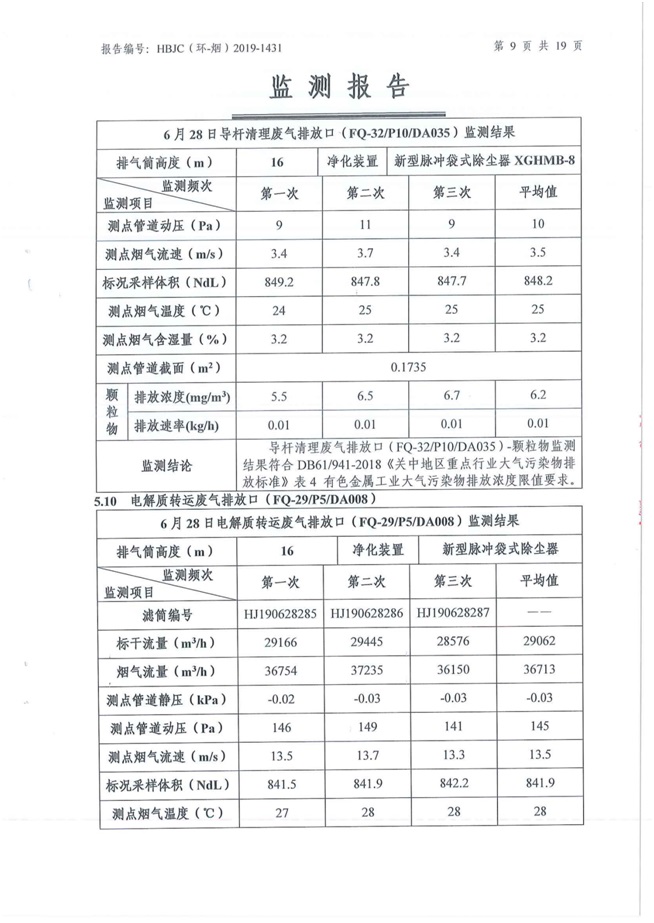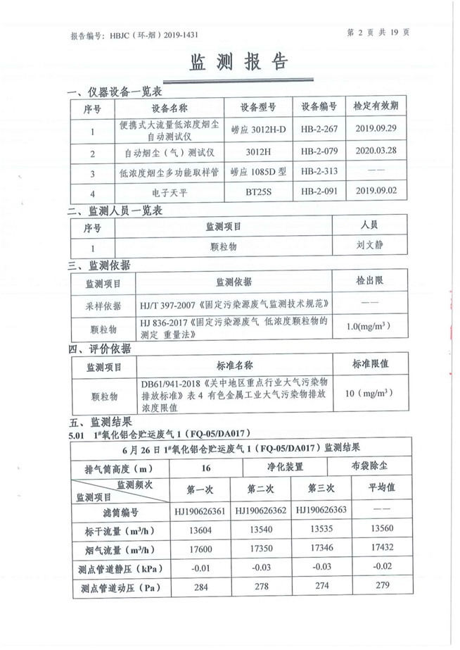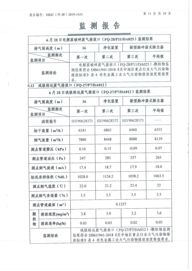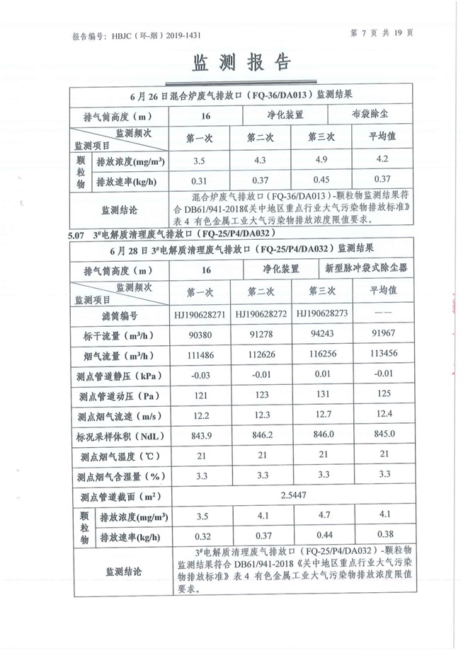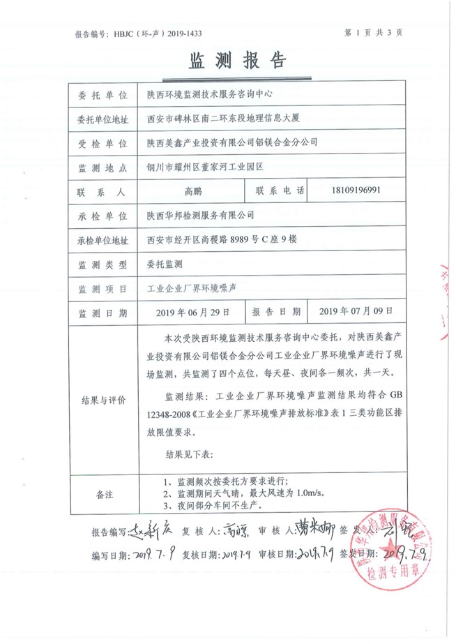 一、基礎(chǔ)信息: 陜西美鑫產(chǎn)業(yè)投資有限公司 統(tǒng)一社會(huì)信用代碼:91610200567136996Y 法定代表人:高曉兵 生產(chǎn)地址:陜西省銅川市董家河工業(yè)園區(qū) 聯(lián)系方式:09196982605 生產(chǎn)經(jīng)營和管理服務(wù)的主要內(nèi)容、產(chǎn)品及規(guī)模: 美鑫公司在陜西有色、陜西煤化兩大集團(tuán)的正確領(lǐng)導(dǎo)下,在銅川市委、市政府的關(guān)心支持下,充分利用銅川資源型城市轉(zhuǎn)型政策,依托園區(qū)區(qū)位優(yōu)勢,擬投資150億元,建設(shè)年產(chǎn)30萬噸預(yù)焙陽極、120萬噸煤礦、30萬噸鋁鎂合金及配套動(dòng)力站、20萬噸鋁深加工、年吞吐量500—800萬噸物流園等循環(huán)經(jīng)濟(jì)項(xiàng)目。該集群項(xiàng)目已被列入《陜西省國民經(jīng)濟(jì)和社會(huì)發(fā)展第十二個(gè)五年規(guī)劃綱要》,為陜西省“58123”項(xiàng)目之一。美鑫公司以循環(huán)經(jīng)濟(jì)為路徑,堅(jiān)持經(jīng)濟(jì)增長與環(huán)境保護(hù)協(xié)調(diào)發(fā)展,聚合資源與資本,走綠色發(fā)展、清潔發(fā)展、低碳發(fā)展的循環(huán)經(jīng)濟(jì)轉(zhuǎn)型升級之路。 陜西美鑫鋁鎂合金分公司采用的500kA預(yù)焙陽極電解槽,自動(dòng)化程度高,電解槽打殼、加料全過程均由微機(jī)自動(dòng)控制,從而使槽罩開啟次數(shù)顯著降低,電解槽集氣效率能夠達(dá)到99%,大大地減少了煙氣無組織排放。項(xiàng)目配置了2套電解煙氣凈化系統(tǒng),經(jīng)捕集的煙氣通過排煙支管進(jìn)入排煙總管,采用電解鋁生產(chǎn)原料—氧化鋁吸附阻濾煙氣中的氟化氫氣體及含氟煙塵,吸附后的載負(fù)氧化鋁進(jìn)入袋式除塵器,經(jīng)氣固分離后進(jìn)入石灰石—石膏脫硫系統(tǒng)脫硫。 陜西美鑫產(chǎn)業(yè)投資有限公司鋁鎂合金分公司2019年2季度自行監(jiān)測如下: 二、監(jiān)測方案: 1 大氣污染源監(jiān)測