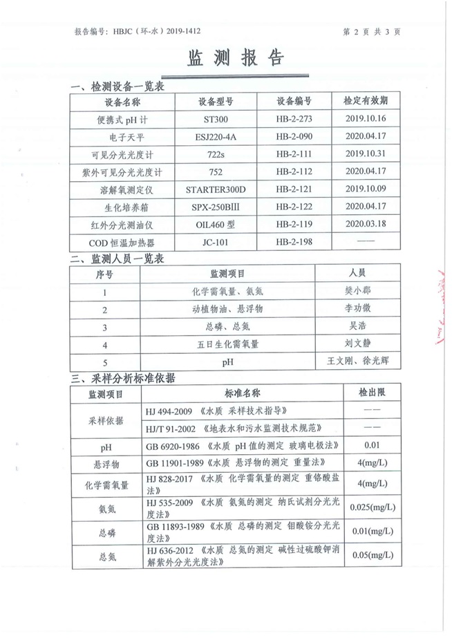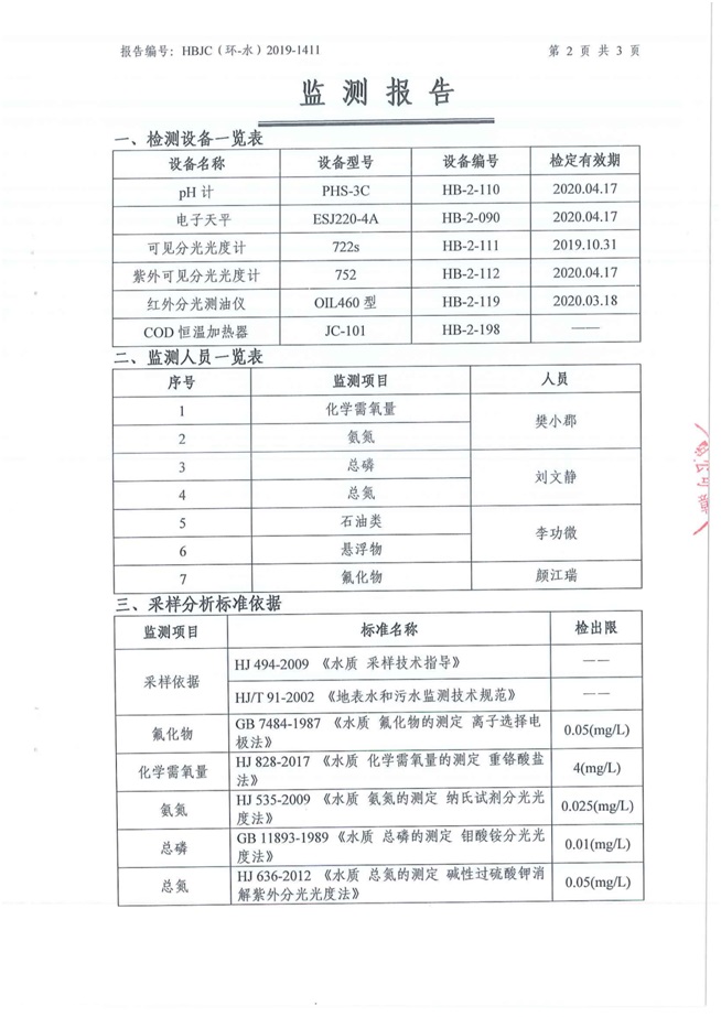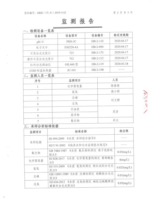 (1)監(jiān)測指標(biāo):化學(xué)需氧量、氨氮、懸浮物、總磷、石油類、氟化物、總氮。 (2)監(jiān)測點(diǎn)位:生產(chǎn)廢水排放口。 (3)監(jiān)測頻次:每月監(jiān)測一次,監(jiān)測1天,每天監(jiān)測1個(gè)水樣。 3廠界噪聲監(jiān)測