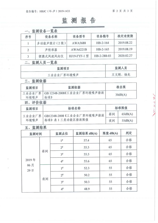 (1)監(jiān)測指標(biāo):等效連續(xù)A聲級。 (2)監(jiān)測點(diǎn)位:廠界四周設(shè)置4個(gè)監(jiān)測點(diǎn)位。 (3)監(jiān)測頻次:每季度監(jiān)測一次,監(jiān)測1天,晝夜各監(jiān)測1次。 三、監(jiān)測報(bào)告: