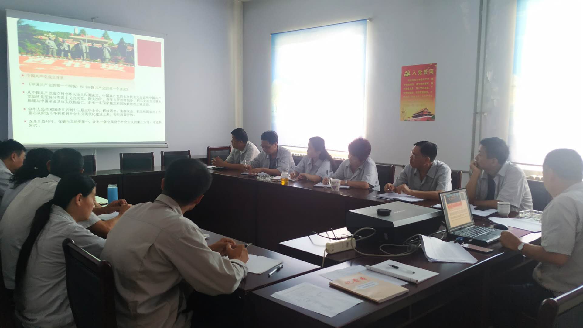 9月2日下午,銅鋁留守處組織開展“書記講黨課”專題教育活動,牢固基層黨組織建設(shè)這塊基石,更好推動黨的建設(shè),時刻保持黨的先進(jìn)性。 首先,銅鋁留守處黨委書記孫明軍以《不忘初心》為題精心制作了黨課PPT課件,從中國共產(chǎn)黨召開的十九次代表大會確立的宗旨始終就是“為人民謀幸!眮碇v中國共產(chǎn)黨的初心和使命。開篇從1917年俄國十月革命的勝利給中國送來了馬克思列寧主義,使中國的先進(jìn)分子找到了救國救民的真理,馬克思列寧主義在中國的廣泛傳播,為中國共產(chǎn)黨的建立奠定了思想基礎(chǔ)。到1919年爆發(fā)的五四運動,促進(jìn)了馬克思主義同中國工人運動的結(jié)合,為中國共產(chǎn)黨的建立作了思想上和干部上的準(zhǔn)備。1920年初,李大釗、陳獨秀等開始了建黨的探索和醞釀等時代背景闡述了中國共產(chǎn)黨成立的成熟條件。1921年7月中共一大通過的中國共產(chǎn)黨的第一個綱領(lǐng)和第一個決議,充分說明黨自誕生之日起就是一個新型的以共產(chǎn)主義為目的、以馬克思主義為行動指南的、統(tǒng)一的無產(chǎn)階級革命的政黨,這必然使中國革命的面貌煥然一新。接著,從中國共產(chǎn)黨成立到中華人民共和國成立的烽火28年中,中國共產(chǎn)黨的七次代表大會證明中國共產(chǎn)黨始終是堅持馬克思主義的政黨。黨的根基在人民、血脈在人民、力量在人民,帶領(lǐng)人民創(chuàng)造美好生活,是我們黨始終不渝的奮斗目標(biāo)。最后,從中華人民共和國成立后到十三屆三中全會,解放思想,實事求是,把黨和國家的工作重心從階級斗爭轉(zhuǎn)移到社會主義現(xiàn)代化建設(shè)上來,實行改革開放。在破與立的變革中,走出一條中國特色社會主義的康莊大道,走進(jìn)新時代。2017年10月24日,歷史性的時刻。人民大會堂萬人大禮堂,出席黨的十九大閉幕會的2300多名代表和特邀代表莊嚴(yán)表決,通過關(guān)于《中國共產(chǎn)黨章程(修正案)》的決議,習(xí)近平新時代中國特色社會主義思想正式寫入中國共產(chǎn)黨章程。再次確立中國共產(chǎn)黨人的初心和使命,就是為中國人民謀幸福,為中華民族謀復(fù)興。 |