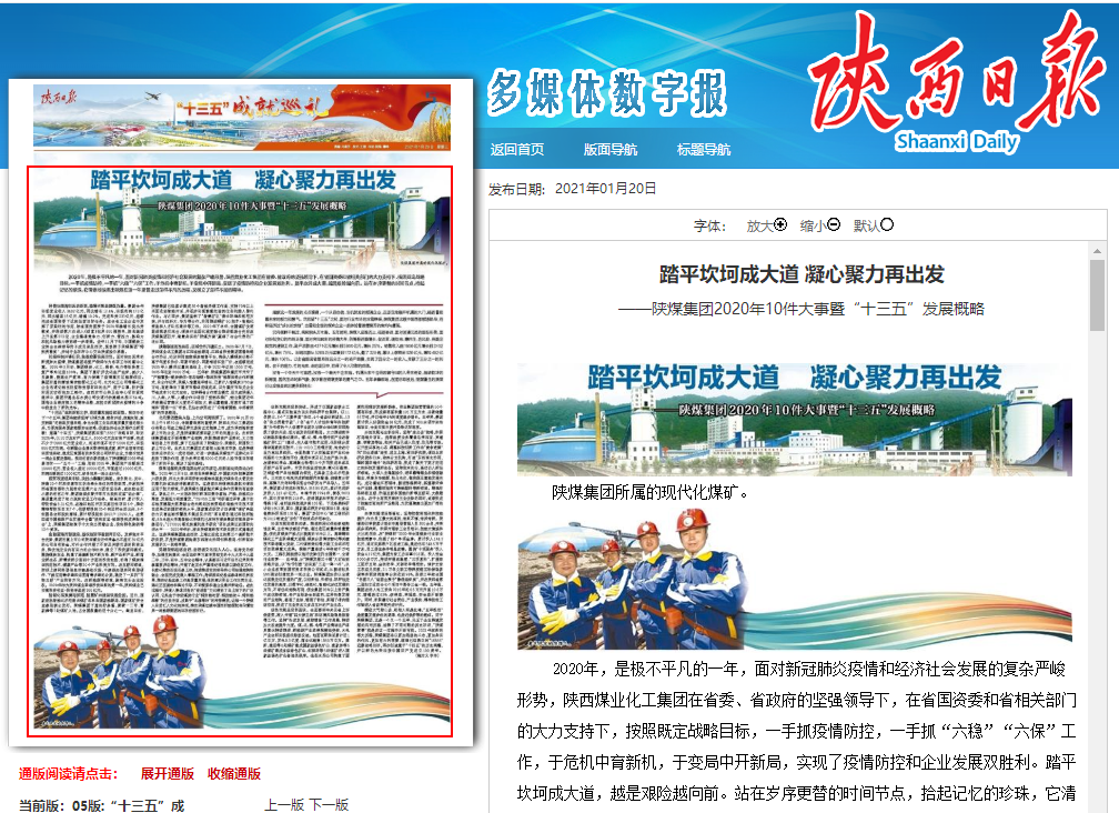 踏平坎坷成大道 凝心聚力再出發(fā) ——陜煤集團(tuán)2020年10件大事暨“十三五”發(fā)展概略 2020年,是極不平凡的一年,面對新冠肺炎疫情和經(jīng)濟(jì)社會發(fā)展的復(fù)雜嚴(yán)峻形勢,陜西煤業(yè)化工集團(tuán)在省委、省政府的堅強(qiáng)領(lǐng)導(dǎo)下,在省國資委和省相關(guān)部門的大力支持下,按照既定戰(zhàn)略目標(biāo),一手抓疫情防控,一手抓“六穩(wěn)”“六保”工作,于危機(jī)中育新機(jī),于變局中開新局,實(shí)現(xiàn)了疫情防控和企業(yè)發(fā)展雙勝利。踏平坎坷成大道,越是艱險越向前。站在歲序更替的時間節(jié)點(diǎn),拾起記憶的珍珠,它清晰地映照出陜煤在這一年里曾走過怎樣不凡的歷程,又樹立了怎樣不屈的精神。 經(jīng)營業(yè)績再創(chuàng)歷史新高,穩(wěn)增長彰顯陜煤力量。集團(tuán)全年實(shí)現(xiàn)營業(yè)收入3402億元,同比增長12.4%,實(shí)現(xiàn)利潤173億元,同比增盈16億元,增幅10.2%。完成投資233億元,超額完成省國資委下達(dá)的經(jīng)營目標(biāo)任務(wù)。在全省工業(yè)企業(yè)中發(fā)揮了頂梁柱的作用,被省國資委授予2020年穩(wěn)增長突出貢獻(xiàn)獎,并連續(xù)第六次進(jìn)入《財富》世界500強(qiáng)榜單,排名繼續(xù)上升至第273位,企業(yè)整體競爭力、創(chuàng)新力、管控力、影響力和抗風(fēng)險能力得到進(jìn)一步增強(qiáng)。去年11月下旬,中國煤炭工業(yè)協(xié)會全體領(lǐng)導(dǎo)班子成員親赴西安,現(xiàn)場授予陜煤集團(tuán)“特別貢獻(xiàn)獎”,并將行業(yè)標(biāo)桿中心交由陜煤股份承建。 抗疫保供沖鋒在前,急難險重鐵肩擔(dān)當(dāng)。面對突如其來的新冠肺炎疫情,陜煤集團(tuán)將復(fù)產(chǎn)保供作為各項工作的重中之重。2020年3月初,集團(tuán)煤炭、化工、鋼鐵、電力等板塊復(fù)工復(fù)產(chǎn)率均達(dá)到100%。集團(tuán)下屬礦井優(yōu)化生產(chǎn)組織,減少人員聚集,提高生產(chǎn)效率,有力保障了疫情重災(zāi)區(qū)能源供應(yīng)。集團(tuán)所屬的蒲城清潔能源化工公司、北元化工公司等煤化工企業(yè)迅速切轉(zhuǎn)至防疫物資原材料的生產(chǎn),用于口罩、防護(hù)服所用無紡布的加工制作。在西安市公共衛(wèi)生中心項目緊張建設(shè)中,集團(tuán)所屬生態(tài)水泥公司快速行動捐贈水泥2754噸。國有企業(yè)鐵肩擔(dān)義的精神品格,在抗擊新冠肺炎疫情的斗爭中綻放出了新的光華。 “十四五”規(guī)劃新鮮出爐,高質(zhì)量發(fā)展繪就藍(lán)圖。規(guī)劃中的下一個五年,集團(tuán)將繼續(xù)堅持“以煤為基,能材并進(jìn),技融雙驅(qū),蛻變轉(zhuǎn)型”的轉(zhuǎn)型發(fā)展戰(zhàn)略,爭當(dāng)全國工業(yè)經(jīng)濟(jì)高質(zhì)量發(fā)展的排頭兵,為更好服務(wù)國家能源安全戰(zhàn)略、促進(jìn)經(jīng)濟(jì)社會發(fā)展作出新貢獻(xiàn)!展望“十四五”,陜煤集團(tuán)要實(shí)現(xiàn)“16555”戰(zhàn)略目標(biāo),即到2025年,以10萬左右產(chǎn)業(yè)工人,6000億元左右資產(chǎn)總額,完成不少于5000億元營業(yè)收入,流通市值不低于5000億元,實(shí)現(xiàn)500億元利潤。創(chuàng)新型企業(yè)建設(shè)取得明顯成效,新產(chǎn)業(yè)培育實(shí)現(xiàn)實(shí)質(zhì)性突破,建成區(qū)域國有資本投資公司標(biāo)桿企業(yè),為建設(shè)世界一流企業(yè)奠定基礎(chǔ)。規(guī)劃還首次研究提出了陜煤集團(tuán)2035年遠(yuǎn)景目標(biāo)——“五個一”工程,即到2035年,集團(tuán)資產(chǎn)總額超過10000億元,營業(yè)收入超過10000億元,市值超過10000億元,利潤總額超過1000億元,躋身世界一流企業(yè)行列。 脫貧攻堅成果豐碩,決勝小康履約踐諾。肩負(fù)陜北、關(guān)中、陜南20個村和安康市漢陰縣牽頭單位的幫扶職責(zé),并承擔(dān)陜西省國資委助力脫貧攻堅第六合力團(tuán)攻堅任務(wù),在決勝全面小康的收官之年,集團(tuán)繼續(xù)多措并舉打出脫貧攻堅“組合拳”,高質(zhì)量完成了助力脫貧攻堅工作任務(wù)。截至目前,累計投入幫扶資金8.31億元,在榆林地區(qū)開發(fā)實(shí)施扶貧項目6個,推動精準(zhǔn)幫扶項目317個,包聯(lián)幫扶的20個貧困村全部出列、9個貧困縣全部脫貧摘帽,累計幫扶脫貧3802戶12099人。在第四屆中國能源產(chǎn)業(yè)發(fā)展年會暨“脫貧攻堅·能源扶貧成果報告會”上,陜煤集團(tuán)被授予十大突出貢獻(xiàn)企業(yè)、扶貧特色案例等12個獎項。 金融藍(lán)海弄潮逐浪,股權(quán)投資浮盈超兩百億。發(fā)揮資本平臺優(yōu)勢,集團(tuán)所屬上市公司陜西煤業(yè)近年來拿出不超過30億元的公司自有資金,對外合作開展了不涉及關(guān)聯(lián)交易的投資業(yè)務(wù),擇優(yōu)選定業(yè)內(nèi)有實(shí)力的合作伙伴,建立了投資顧問模式。圍繞煤炭主業(yè),構(gòu)建了涵蓋新技術(shù)新方法、新產(chǎn)品新產(chǎn)業(yè)、新商業(yè)新生態(tài)、新需求新價值四個方面的投資地圖,明確了煤炭清潔利用技術(shù)、煤基產(chǎn)品等20個產(chǎn)業(yè)投資方向。在互聯(lián)網(wǎng)領(lǐng)域,按照上游網(wǎng)絡(luò)層信息傳輸基礎(chǔ)設(shè)施、中游感知層和網(wǎng)絡(luò)層硬件、下游應(yīng)用需求端和運(yùn)營商需求端的分類,確定了一系列“萬物互聯(lián)”產(chǎn)業(yè)投資方