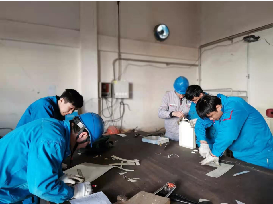 春節(jié)剛過,電廠檢修部機(jī)務(wù)操作間里一片忙碌景象。大家手持鋼板尺、錘頭和鐵皮剪等工具,正爭先恐后的進(jìn)行著一場激烈的技能比賽——制作鐵皮油盤。