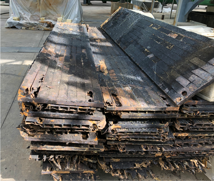 自陽極分公司焙燒車間電捕焦油器瀝青焦油清理完成并投入運(yùn)行以來,煙氣排放指標(biāo)穩(wěn)定,效果較為明顯。但由于近一段時(shí)間以來的高負(fù)荷運(yùn)行,以及設(shè)備長期受瀝青焦油的侵蝕,部分極板出現(xiàn)損壞現(xiàn)象,捕集、吸附能力減弱,甚至引起電暈閉塞、系統(tǒng)電流降低等現(xiàn)象。