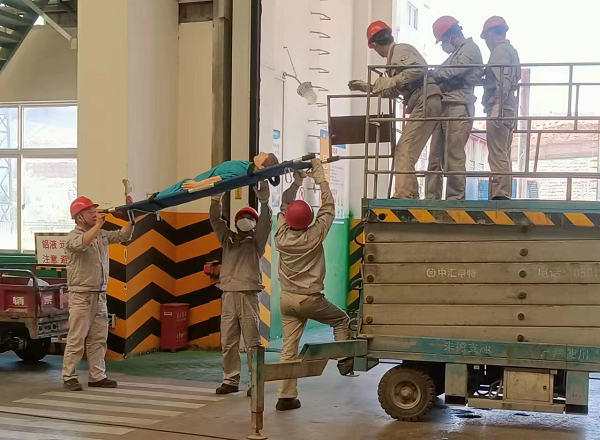 為貫徹落實鋁鎂合金分公司重大事故隱患專項排查整治2023行動實施方案,確保檢修人員進行高空、高溫作業(yè)中暑時能迅速、正確的進行救助,保障職工生命安全。6月14日檢修車間攜手電解一車間組織在崗職工進行了“電解車間高空作業(yè)中暑應(yīng)急演練”。 演練前,檢修車間組織全體參演人員集中學(xué)習(xí)了演練預(yù)案,進一步熟悉中暑的癥狀及救治注意事項等。演練現(xiàn)場模擬一名檢修工在巡檢電解多功能機組時發(fā)生高溫中暑暈倒,監(jiān)護人員發(fā)現(xiàn)后,立即電話向車間主任匯報,車間主任隨即下令啟動應(yīng)急預(yù)案。救援人員攜帶必要等救援物資快速到達救援現(xiàn)場,利用升降平臺、擔(dān)架進行救援等分工協(xié)作展開救援,很快中暑人員被安全運送至通道口通風(fēng)良好處,進行心肺復(fù)蘇急救后,用濕毛巾擦拭中暑人員頭部、胸前,為中暑人員進行物理降溫的同時給其喝下藿香正氣水。不一會中暑人員癥狀便有明顯改善,休息片刻便能自行站立,至此演練結(jié)束,車間主任石登強對演練做了總結(jié),并提出不足,將在后期補充方案加以完善。 本次演練,有效檢驗了檢修車間應(yīng)對突發(fā)事件的應(yīng)急處置能力,讓大家現(xiàn)場學(xué)習(xí)了中暑的癥狀、急救知識,有效提高了檢修車間應(yīng)對突發(fā)事件的應(yīng)急處置能力,檢修車間全體員工將銘記“人人講安全、個個會應(yīng)急”的安全生產(chǎn)月主題,嚴(yán)格落實各項安全管控措施,確保分公司年度各項安全目生產(chǎn)標(biāo)順利實現(xiàn)。 |