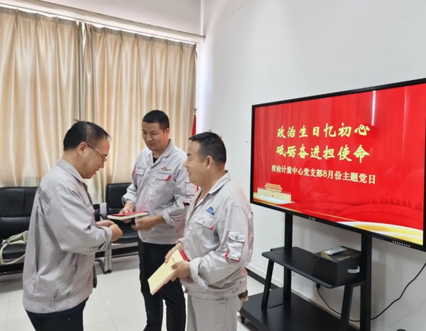 為進(jìn)一步強(qiáng)化黨員身份意識(shí)和責(zé)任意識(shí),激發(fā)黨員的榮譽(yù)感、責(zé)任感和使命感,8月22日下午,質(zhì)檢計(jì)量中心黨支部組織開(kāi)展“政治生日憶初心 砥礪奮進(jìn)擔(dān)使命”主題黨日活動(dòng),通過(guò)“第一議題”學(xué)習(xí)、贈(zèng)送“政治生日”禮物、重溫入黨誓詞、分享生日感言等形式,為兩名在三季度入黨的黨員過(guò)“政治生日”,讓“初心使命”在黨員心中扎根鑄魂。 活動(dòng)中,支部書(shū)記王平領(lǐng)學(xué)了《促進(jìn)民營(yíng)經(jīng)濟(jì)健康發(fā)展、高質(zhì)量發(fā)展》一文。并為兩名黨員送上精心制作的政治生日卡及《中國(guó)共產(chǎn)黨章程》、黨員徽章、理論學(xué)習(xí)書(shū)籍等。隨后,在領(lǐng)誓員帶領(lǐng)下,全體黨員面向黨旗、莊嚴(yán)宣誓,重溫入黨誓詞。 在分享“初心故事、回憶入黨經(jīng)歷”的環(huán)節(jié),兩名黨員結(jié)合自身成長(zhǎng)談了自己的感悟。80后黨員楊新興表示:“通過(guò)參加組織活動(dòng),不斷汲取政治理論養(yǎng)分,在崗位中磨礪和學(xué)習(xí),我對(duì)“黨員”二字的內(nèi)涵和價(jià)值有了更切身地體會(huì),接下來(lái)我要多向老同志學(xué)經(jīng)驗(yàn),把崗位當(dāng)戰(zhàn)場(chǎng),用實(shí)干扛責(zé)任!。入黨30余年的老黨員張立峰說(shuō):“現(xiàn)在雖然快到退休年紀(jì),但我始終銘記入黨誓言和黨員的初心,我會(huì)繼續(xù)站好崗、帶好頭,為年輕人樹(shù)立榜樣,為組織貢獻(xiàn)自己的力量。 活動(dòng)最后,王平送上生日寄語(yǔ)并提出要求:感謝兩位不同時(shí)期入黨同志真摯而精彩的分享,相信大家也深受觸動(dòng)。希望中心黨員將今日的感動(dòng)轉(zhuǎn)化為明天的行動(dòng),立足崗位、作出貢獻(xiàn),讓黨的旗幟在質(zhì)檢計(jì)量中心的每一個(gè)崗位上高高飄揚(yáng)。 |