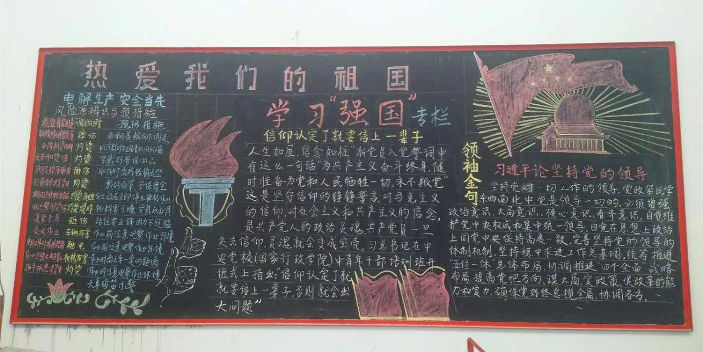 在微信時(shí)代,提起“黑板報(bào)”,人們往往會(huì)嗤之以鼻:老掉牙的東西,何足以提?…… 然而,鋁鎂合金500KA系列投運(yùn)以來,電解一車間舉辦的幾期宣傳黑板報(bào),卻讓人眼前一亮:卡通動(dòng)漫、吉祥彩燈、飄舞彩旗、熊熊火炬、雄偉的禮堂……,喜慶的節(jié)日氣氛、濃烈的革命傳統(tǒng)……被幾根粉筆鮮活地勾勒出來。