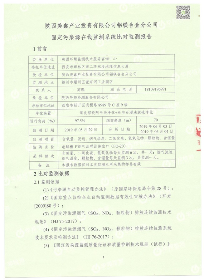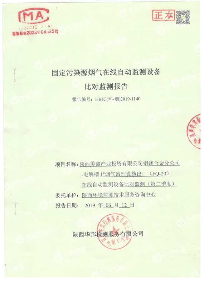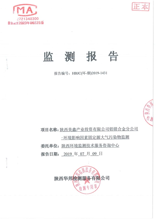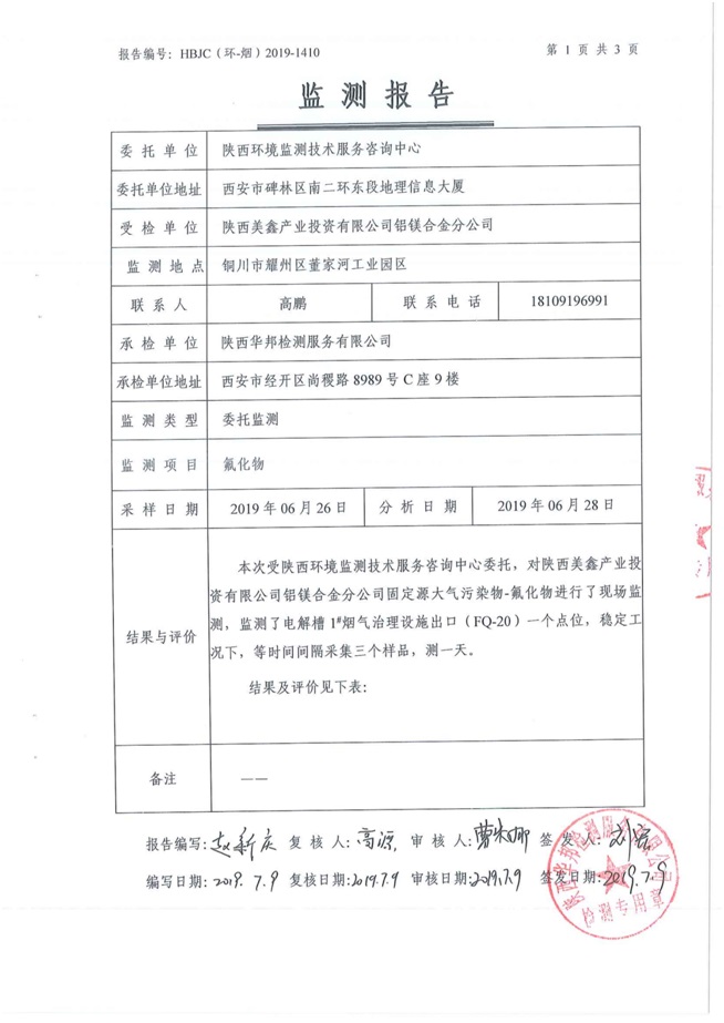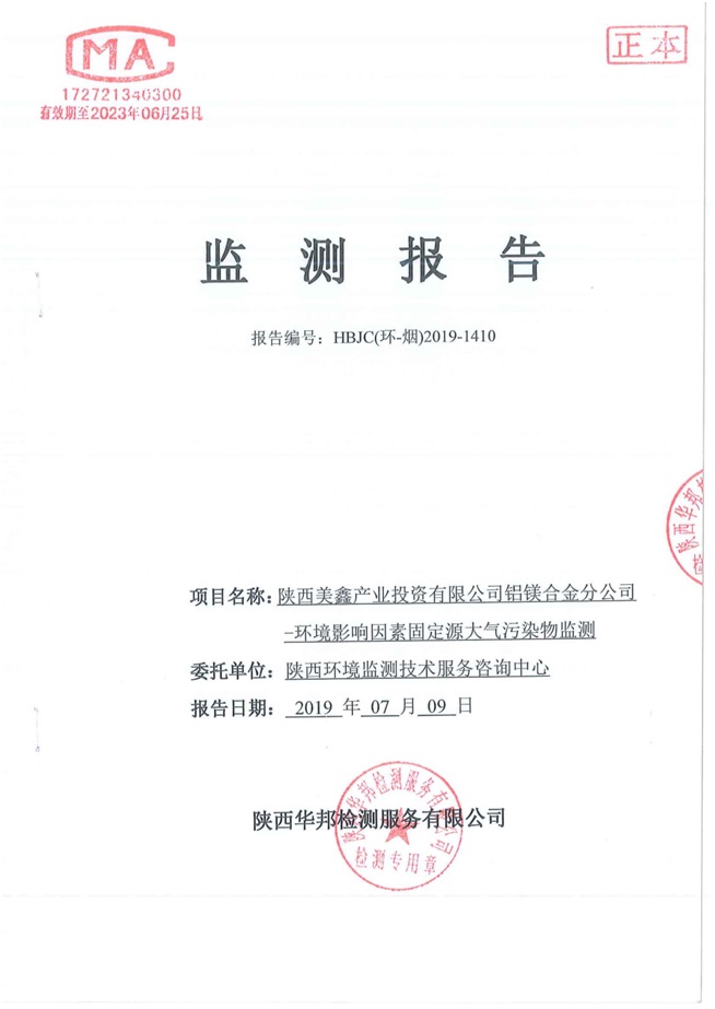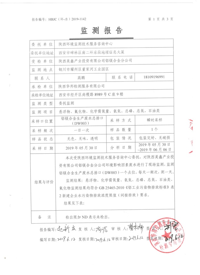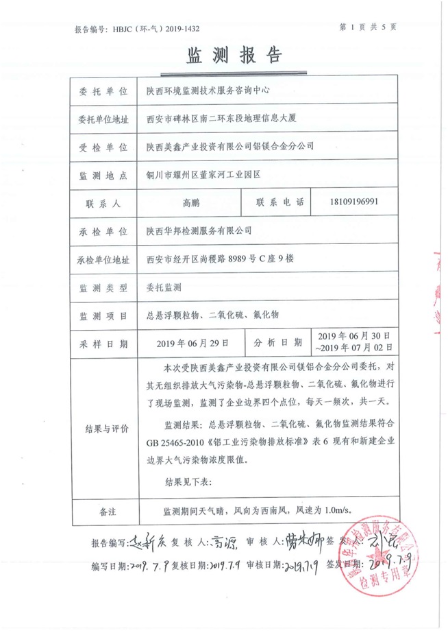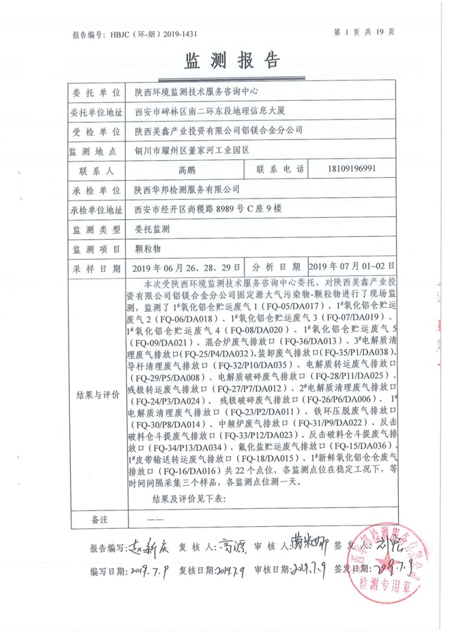 一、基礎(chǔ)信息: 陜西美鑫產(chǎn)業(yè)投資有限公司 統(tǒng)一社會(huì)信用代碼:91610200567136996Y 法定代表人:高曉兵 生產(chǎn)地址:陜西省銅川市董家河工業(yè)園區(qū) 聯(lián)系方式:09196982605 生產(chǎn)經(jīng)營和管理服務(wù)的主要內(nèi)容、產(chǎn)品及規(guī)模: 美鑫公司在陜西有色、陜西煤化兩大集團(tuán)的正確領(lǐng)導(dǎo)下,在銅川市委、市政府的關(guān)心支持下,充分利用銅川資源型城市轉(zhuǎn)型政策,依托園區(qū)區(qū)位優(yōu)勢,擬投資150億元,建設(shè)年產(chǎn)30萬噸預(yù)焙陽極、120萬噸煤礦、30萬噸鋁鎂合金及配套動(dòng)力站、20萬噸鋁深加工、年吞吐量500—800萬噸物流園等循環(huán)經(jīng)濟(jì)項(xiàng)目。該集群項(xiàng)目已被列入《陜西省國民經(jīng)濟(jì)和社會(huì)發(fā)展第十二個(gè)五年規(guī)劃綱要》,為陜西省“58123”項(xiàng)目之一。美鑫公司以循環(huán)經(jīng)濟(jì)為路徑,堅(jiān)持經(jīng)濟(jì)增長與環(huán)境保護(hù)協(xié)調(diào)發(fā)展,聚合資源與資本,走綠色發(fā)展、清潔發(fā)展、低碳發(fā)展的循環(huán)經(jīng)濟(jì)轉(zhuǎn)型升級之路。 陜西美鑫鋁鎂合金分公司采用的500kA預(yù)焙陽極電解槽,自動(dòng)化程度高,電解槽打殼、加料全過程均由微機(jī)自動(dòng)控制,從而使槽罩開啟次數(shù)顯著降低,電解槽集氣效率能夠達(dá)到99%,大大地減少了煙氣無組織排放。項(xiàng)目配置了2套電解煙氣凈化系統(tǒng),經(jīng)捕集的煙氣通過排煙支管進(jìn)入排煙總管,采用電解鋁生產(chǎn)原料—氧化鋁吸附阻濾煙氣中的氟化氫氣體及含氟煙塵,吸附后的載負(fù)氧化鋁進(jìn)入袋式除塵器,經(jīng)氣固分離后進(jìn)入石灰石—石膏脫硫系統(tǒng)脫硫。 陜西美鑫產(chǎn)業(yè)投資有限公司鋁鎂合金分公司2019年2季度自行監(jiān)測如下: 二、監(jiān)測方案: 1 大氣污染源監(jiān)測