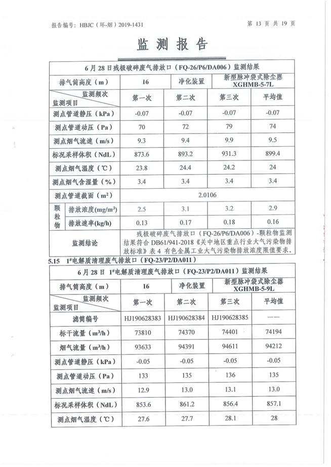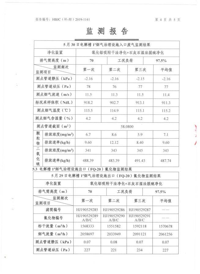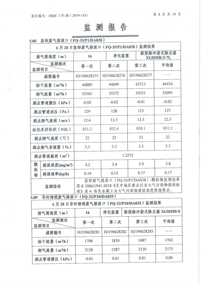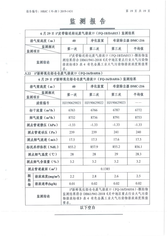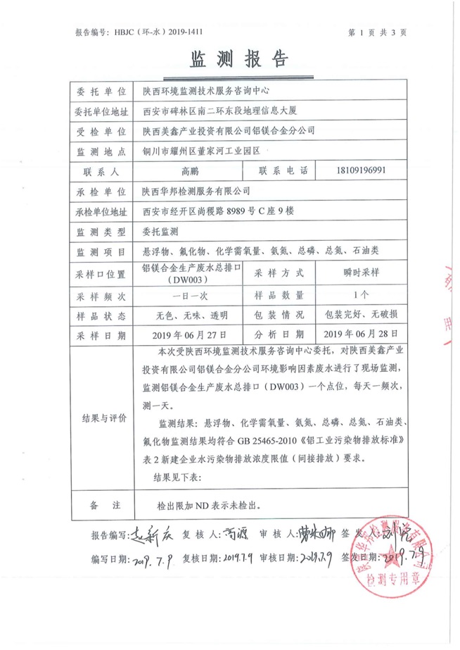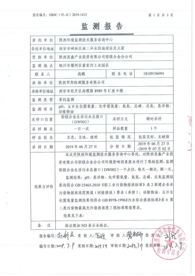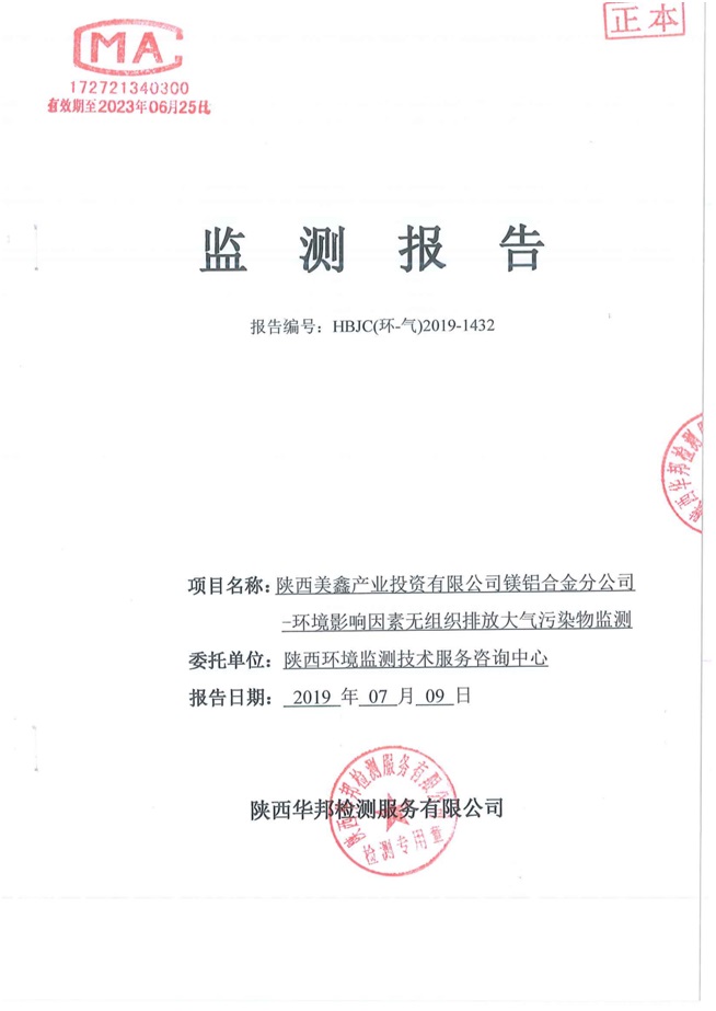 一、基礎(chǔ)信息: 陜西美鑫產(chǎn)業(yè)投資有限公司 統(tǒng)一社會(huì)信用代碼:91610200567136996Y 法定代表人:高曉兵 生產(chǎn)地址:陜西省銅川市董家河工業(yè)園區(qū) 聯(lián)系方式:09196982605 生產(chǎn)經(jīng)營和管理服務(wù)的主要內(nèi)容、產(chǎn)品及規(guī)模: 美鑫公司在陜西有色、陜西煤化兩大集團(tuán)的正確領(lǐng)導(dǎo)下,在銅川市委、市政府的關(guān)心支持下,充分利用銅川資源型城市轉(zhuǎn)型政策,依托園區(qū)區(qū)位優(yōu)勢,擬投資150億元,建設(shè)年產(chǎn)30萬噸預(yù)焙陽極、120萬噸煤礦、30萬噸鋁鎂合金及配套動(dòng)力站、20萬噸鋁深加工、年吞吐量500—800萬噸物流園等循環(huán)經(jīng)濟(jì)項(xiàng)目。該集群項(xiàng)目已被列入《陜西省國民經(jīng)濟(jì)和社會(huì)發(fā)展第十二個(gè)五年規(guī)劃綱要》,為陜西省“58123”項(xiàng)目之一。美鑫公司以循環(huán)經(jīng)濟(jì)為路徑,堅(jiān)持經(jīng)濟(jì)增長與環(huán)境保護(hù)協(xié)調(diào)發(fā)展,聚合資源與資本,走綠色發(fā)展、清潔發(fā)展、低碳發(fā)展的循環(huán)經(jīng)濟(jì)轉(zhuǎn)型升級之路。 陜西美鑫鋁鎂合金分公司采用的500kA預(yù)焙陽極電解槽,自動(dòng)化程度高,電解槽打殼、加料全過程均由微機(jī)自動(dòng)控制,從而使槽罩開啟次數(shù)顯著降低,電解槽集氣效率能夠達(dá)到99%,大大地減少了煙氣無組織排放。項(xiàng)目配置了2套電解煙氣凈化系統(tǒng),經(jīng)捕集的煙氣通過排煙支管進(jìn)入排煙總管,采用電解鋁生產(chǎn)原料—氧化鋁吸附阻濾煙氣中的氟化氫氣體及含氟煙塵,吸附后的載負(fù)氧化鋁進(jìn)入袋式除塵器,經(jīng)氣固分離后進(jìn)入石灰石—石膏脫硫系統(tǒng)脫硫。 陜西美鑫產(chǎn)業(yè)投資有限公司鋁鎂合金分公司2019年2季度自行監(jiān)測如下: 二、監(jiān)測方案: 1 大氣污染源監(jiān)測