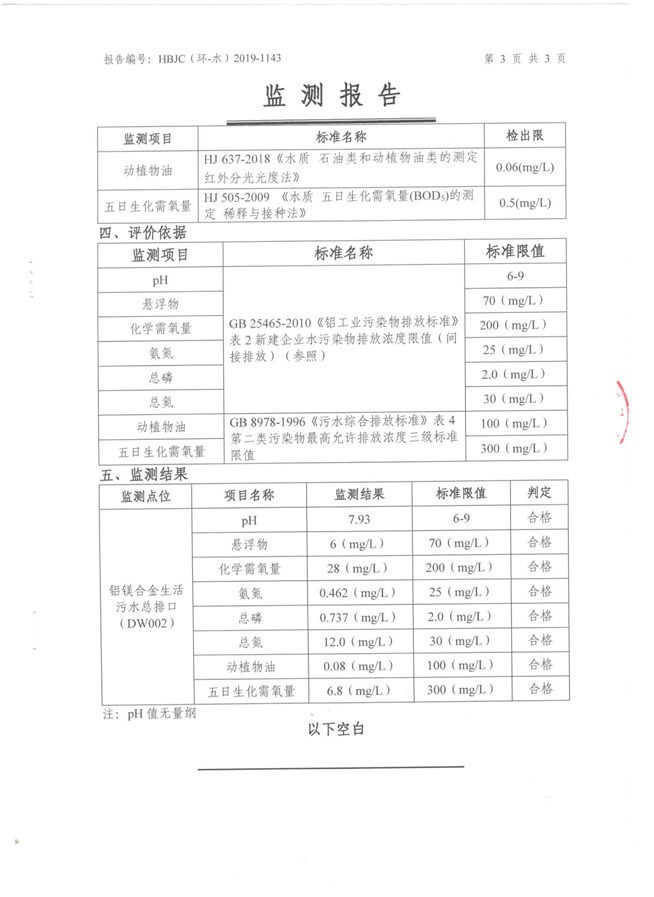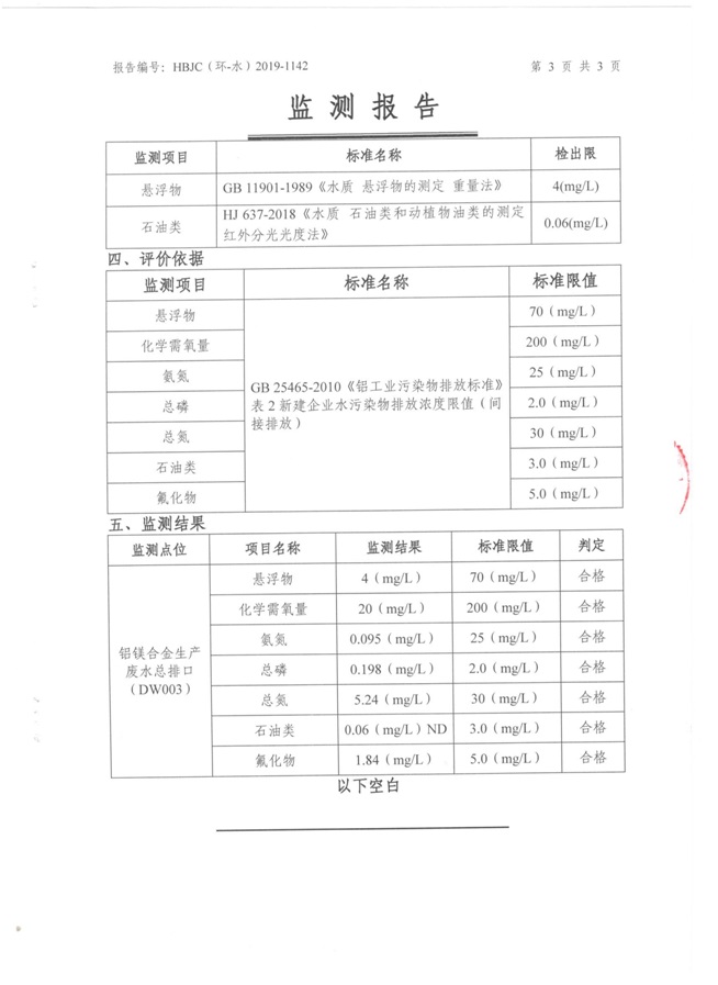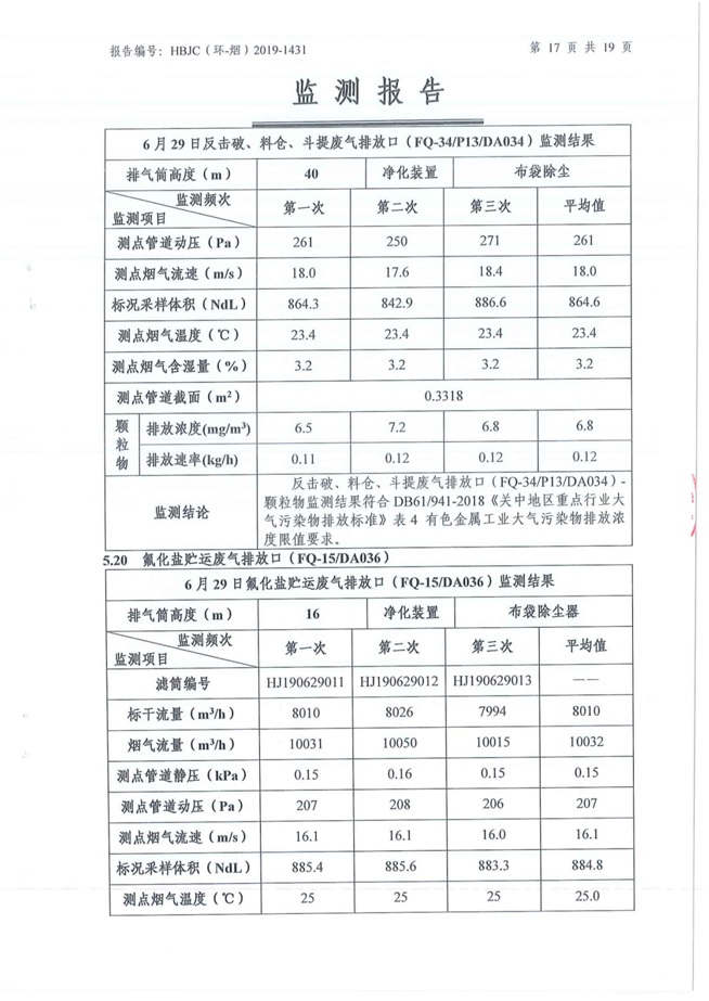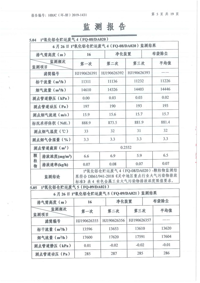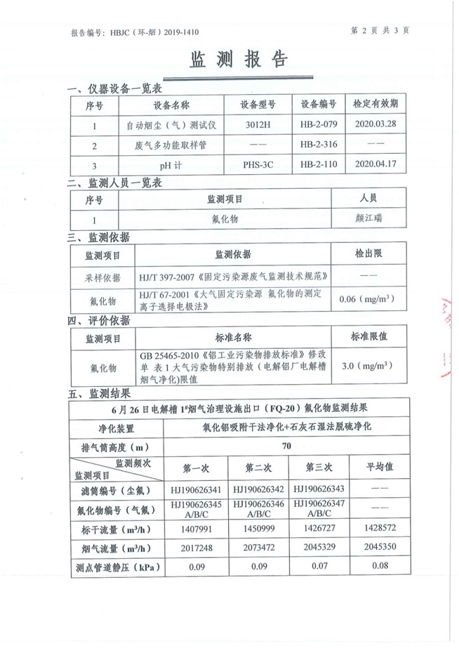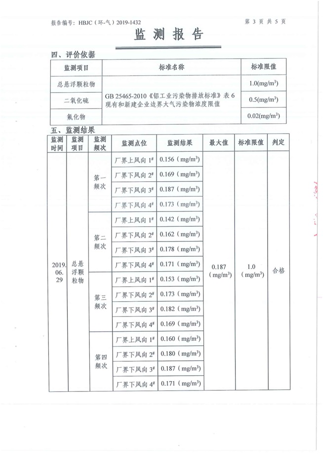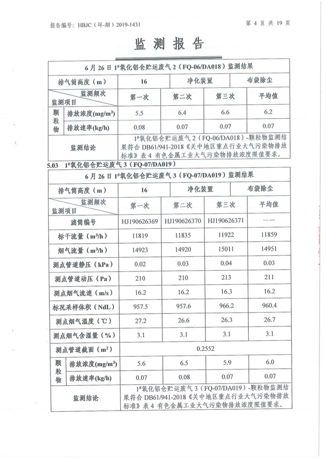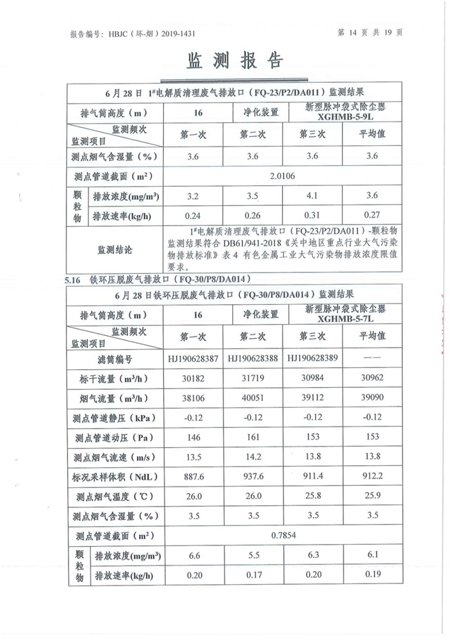 一、基礎(chǔ)信息: 陜西美鑫產(chǎn)業(yè)投資有限公司 統(tǒng)一社會(huì)信用代碼:91610200567136996Y 法定代表人:高曉兵 生產(chǎn)地址:陜西省銅川市董家河工業(yè)園區(qū) 聯(lián)系方式:09196982605 生產(chǎn)經(jīng)營和管理服務(wù)的主要內(nèi)容、產(chǎn)品及規(guī)模: 美鑫公司在陜西有色、陜西煤化兩大集團(tuán)的正確領(lǐng)導(dǎo)下,在銅川市委、市政府的關(guān)心支持下,充分利用銅川資源型城市轉(zhuǎn)型政策,依托園區(qū)區(qū)位優(yōu)勢,擬投資150億元,建設(shè)年產(chǎn)30萬噸預(yù)焙陽極、120萬噸煤礦、30萬噸鋁鎂合金及配套動(dòng)力站、20萬噸鋁深加工、年吞吐量500—800萬噸物流園等循環(huán)經(jīng)濟(jì)項(xiàng)目。該集群項(xiàng)目已被列入《陜西省國民經(jīng)濟(jì)和社會(huì)發(fā)展第十二個(gè)五年規(guī)劃綱要》,為陜西省“58123”項(xiàng)目之一。美鑫公司以循環(huán)經(jīng)濟(jì)為路徑,堅(jiān)持經(jīng)濟(jì)增長與環(huán)境保護(hù)協(xié)調(diào)發(fā)展,聚合資源與資本,走綠色發(fā)展、清潔發(fā)展、低碳發(fā)展的循環(huán)經(jīng)濟(jì)轉(zhuǎn)型升級之路。 陜西美鑫鋁鎂合金分公司采用的500kA預(yù)焙陽極電解槽,自動(dòng)化程度高,電解槽打殼、加料全過程均由微機(jī)自動(dòng)控制,從而使槽罩開啟次數(shù)顯著降低,電解槽集氣效率能夠達(dá)到99%,大大地減少了煙氣無組織排放。項(xiàng)目配置了2套電解煙氣凈化系統(tǒng),經(jīng)捕集的煙氣通過排煙支管進(jìn)入排煙總管,采用電解鋁生產(chǎn)原料—氧化鋁吸附阻濾煙氣中的氟化氫氣體及含氟煙塵,吸附后的載負(fù)氧化鋁進(jìn)入袋式除塵器,經(jīng)氣固分離后進(jìn)入石灰石—石膏脫硫系統(tǒng)脫硫。 陜西美鑫產(chǎn)業(yè)投資有限公司鋁鎂合金分公司2019年2季度自行監(jiān)測如下: 二、監(jiān)測方案: 1 大氣污染源監(jiān)測