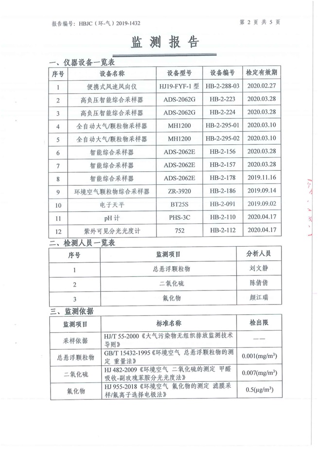 (1)監(jiān)測指標(biāo):顆粒物; (2)監(jiān)測點(diǎn)位:共計(jì)30個(gè)一般排放口(現(xiàn)啟用22個(gè)); (3)監(jiān)測頻次:每半年監(jiān)測一次,連續(xù)監(jiān)測1天,等時(shí)間間隔采集3個(gè)樣品。 1.4廠界顆粒物、二氧化硫、氟化物監(jiān)測