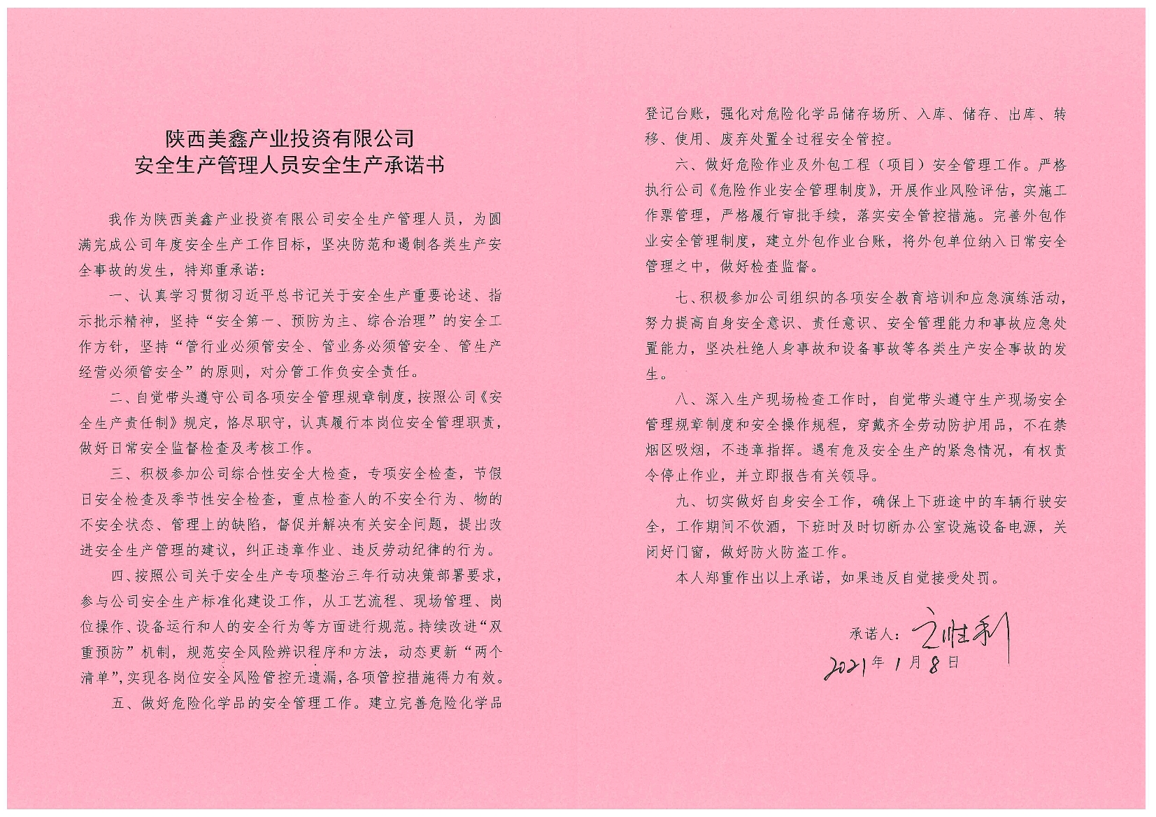 陜西美鑫產(chǎn)業(yè)投資有限公司安全承諾