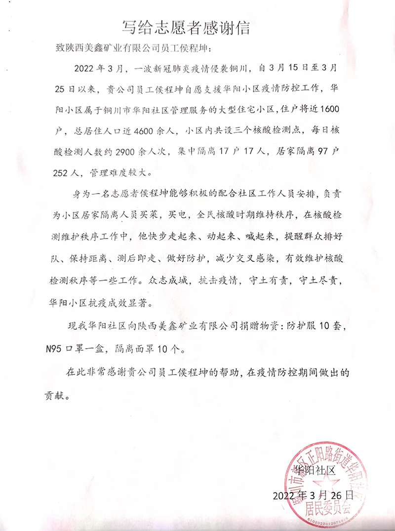 3月14日,“新冠病毒”疫情的突襲,使整個(gè)銅川按下了暫停鍵。防控形勢(shì)驟然緊張,防控工作壓力驟增。關(guān)鍵時(shí)刻,公司黨委發(fā)出倡議,號(hào)召廣大黨員干部積極發(fā)揮先鋒模范作用,主動(dòng)投身疫情防控工作,礦業(yè)公司的侯程坤積極響應(yīng)號(hào)召,成為眾多“逆行者”中的一員。 “疾風(fēng)知?jiǎng)挪,危難顯擔(dān)當(dāng)”,我為防“疫”出把力。 侯程坤,男,1994年5月1日出生,目前在礦業(yè)公司供銷部從事磅房管理工作。據(jù)了解,疫情發(fā)生時(shí)侯程坤正在家中輪休,當(dāng)他得知公司黨委的號(hào)召后,經(jīng)與父母短暫溝通后,便立即向當(dāng)?shù)厣鐓^(qū)提出申請(qǐng),義無反顧的加入到“疫情防控”志愿者隊(duì)伍當(dāng)中。在問道他為什么要參加此次志愿者防疫工作時(shí),他淡淡的說到:“在國家危難之際,作為一名國有企業(yè)職工,代表我們企業(yè)為防疫工作出一點(diǎn)力,我感到非常榮幸...” “疫情就是命令,防控就是責(zé)任”,做好每家住戶的防疫工作是我的責(zé)任。 在此次疫情防控工作中,按照當(dāng)?shù)厣鐓^(qū)對(duì)志愿者的工作分配,侯程坤同志被分配到銅川市新區(qū)疫情較為嚴(yán)重的華陽小區(qū)工作。作為我市建設(shè)較早的一批小區(qū),華陽小區(qū)有著顯著的特點(diǎn),小區(qū)大,住戶雜,90%的樓宇目前還沒有安裝電梯,導(dǎo)致防疫工作在物資運(yùn)送、通知核檢、維護(hù)秩序等工作上增加了不少困難。面對(duì)華陽小區(qū)的實(shí)際情況和困難,志愿者們勇敢的扛起了責(zé)任,每天天不亮,侯程坤就戴上N95,穿上防護(hù)服趕到社區(qū),根據(jù)工作安排,和大家一起忙碌著。與侯程坤一起工作的志愿者是這樣描述他的,“此次抗擊疫情,小候同志表現(xiàn)得非常出色。在通知住戶核酸檢測(cè)上,侯程坤每天天微微亮就開始按樓號(hào)通知大家下樓做核酸檢測(cè),維護(hù)秩序。為防止有住戶漏掉,他就一家一戶的敲門通知,做到了人人核酸檢測(cè)。住戶做完核酸檢測(cè)后,他又開始對(duì)小區(qū)住戶需要的生活用品、糧油蔬菜等進(jìn)行分揀,然后馬不停蹄的將物品挨家挨戶送上門。在配送過程中當(dāng)遇到住戶有需求和困難時(shí),他也能及時(shí)反饋并積極解決,真是個(gè)非常不錯(cuò)的小伙子!” “隨時(shí)待命,勇當(dāng)先鋒”,時(shí)刻牢記責(zé)任與擔(dān)當(dāng)。 隨著疫情形勢(shì)的逐漸好轉(zhuǎn),銅川市也積極有序推進(jìn)復(fù)工復(fù)產(chǎn)。在此次疫情防控工作中我們要向參與防疫的醫(yī)務(wù)人員、志愿者表示由衷的感謝,是他們用實(shí)際行動(dòng)為大家筑起了一道道健康的“防火墻”,守護(hù)著我們的安全。當(dāng)問道侯程坤在此次“抗擊疫情”中有什么感悟時(shí),他答到:“雖然志愿服務(wù)結(jié)束了,但這次的經(jīng)歷對(duì)我來講卻是一次非常難得的錘煉,雖然付出了很多的汗水,但是當(dāng)我看到華陽小區(qū)生活秩序得到穩(wěn)定恢復(fù),自己也受到了華陽社區(qū)的表揚(yáng)和認(rèn)可時(shí),我覺得一切付出都是值得的。如若有一天,國家、社會(huì)和我們企業(yè)再一次需要我,我仍將義無反顧的投身第一線,用實(shí)際行動(dòng)來證明國有企業(yè)職工的責(zé)任和擔(dān)當(dāng)! |