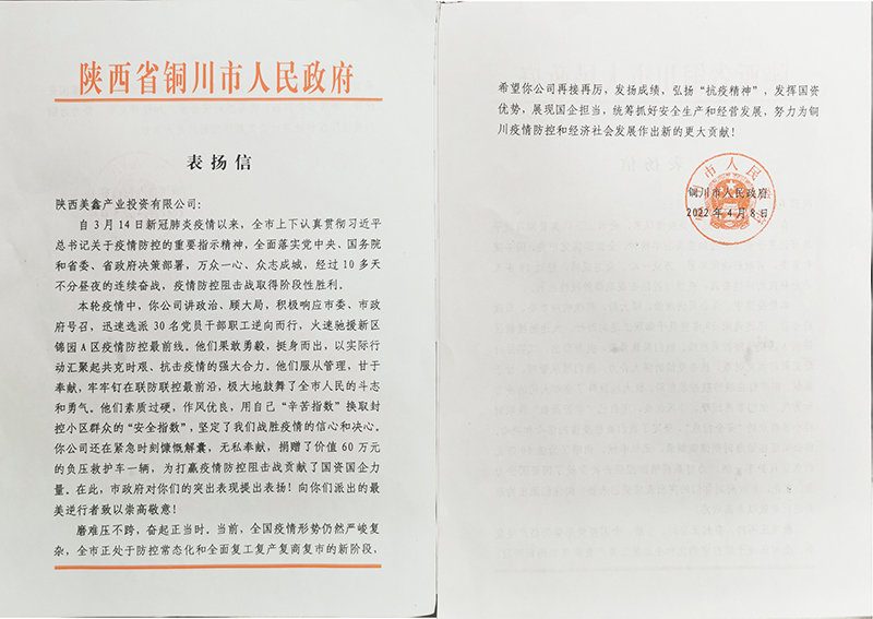 4月上旬,銅川市人民政府向我公司發(fā)來(lái)一封《表?yè)P(yáng)信》,對(duì)公司積極參與銅川市3.14疫情防控工作付出的努力和做出的貢獻(xiàn)表示高度的贊揚(yáng),對(duì)公司主動(dòng)擔(dān)當(dāng)、勇于作為,防疫情、穩(wěn)生產(chǎn)取得的成績(jī)給予充分肯定。 3月21日,公司慷慨解囊,一致通過(guò)向銅川市紅十字會(huì)捐贈(zèng)總價(jià)值60萬(wàn)元的負(fù)壓救護(hù)車(chē)、向銅川市人民醫(yī)院捐贈(zèng)10萬(wàn)元抗疫資金的兩個(gè)重要決定,促使本地更加及時(shí)有效的開(kāi)展基層醫(yī)療服務(wù)以及突發(fā)性公共衛(wèi)生事件的醫(yī)療救援,讓群眾享受更為專(zhuān)業(yè)、快捷的醫(yī)療服務(wù),提升銅川市抗擊疫情的基礎(chǔ)性保障。 |