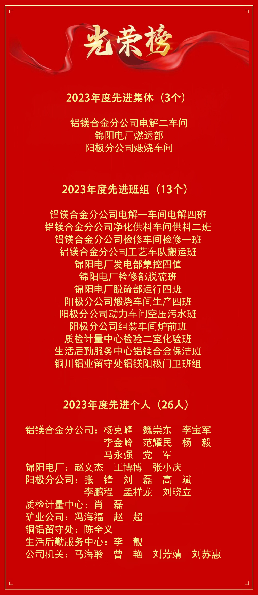 2023年,在集團公司的正確領導下,公司上下以習近平新時代中國特色社會主義思想為指引,全面貫徹落實黨的二十大精神,在廣大干部職工的共同努力下,安全生產(chǎn)、經(jīng)營工作、精益管理等各項工作取得了顯著成績,涌現(xiàn)出一批先進集體和先進個人。 為表彰先進,樹立典型,進一步激發(fā)廣大職工的工作積極性和熱情,經(jīng)基層單位推薦申報,公司先進評選委員會審核,公司黨委研究決定:授予鋁鎂合金分公司電解二車間等 3 個單位“先進集體”榮譽稱號;授予錦陽電廠發(fā)電部集控四值等 13 個班組“先進班組”榮譽稱號;授予楊克峰等 26 名同志“先進個人”榮譽稱號。 希望各單位和全體干部職工向受表彰的先進集體和先進個人學習,以他們?yōu)榘駱,團結協(xié)作、開拓進取、扎實工作、全力以赴,為公司高質量發(fā)展做出新的更大的貢獻! |