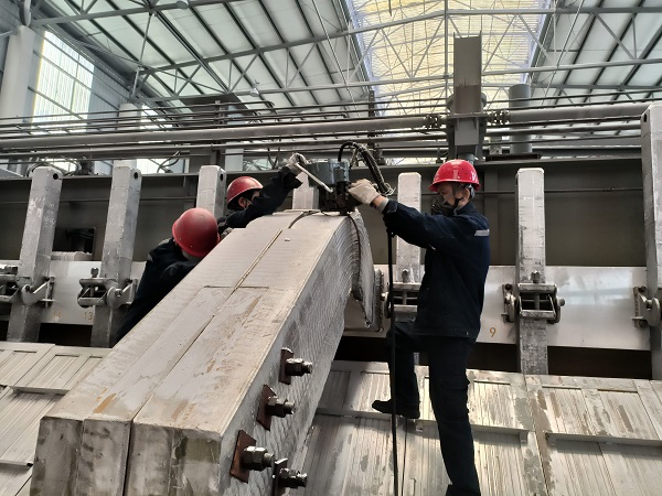電解槽進(jìn)電端軟連接是立柱母線與平衡母線重要的連接部件,起到導(dǎo)電作用,使立柱母線在上下移動(dòng)過程中不會(huì)破壞母線結(jié)構(gòu)。 但在電解作業(yè)過程中,天車打殼機(jī)頭易碰撞到軟連接,致使其產(chǎn)生破損,從而導(dǎo)致壓降增大、電耗增高,直接影響到生產(chǎn)實(shí)際。針對(duì)此種情況,車間安排綜合班人員在不影響正常生產(chǎn)的情況下,對(duì)電解槽進(jìn)電端軟連接鋼帶損壞、脫落部分進(jìn)行捆扎修復(fù)。經(jīng)過5天的努力,600余條電解槽進(jìn)電端軟連接全部修復(fù)完畢,消除了軟連接破損造成的安全隱患和能源消耗。 此次修復(fù)工作,是電解二車間響應(yīng)公司“降本增效”號(hào)召的又一有力舉措。今后,車間將持續(xù)引導(dǎo)動(dòng)員職工積極參與生產(chǎn)設(shè)備設(shè)施的改造、修復(fù),降低生產(chǎn)成本,減少能源損耗,以實(shí)際行動(dòng)助力綠色低碳發(fā)展。 |