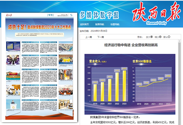 成色十足!盤(pán)點(diǎn)陜煤集團(tuán)2023年十大工作亮點(diǎn) 2023年,在省委、省政府的堅(jiān)強(qiáng)領(lǐng)導(dǎo)下,陜煤集團(tuán)以開(kāi)展主題教育為抓手,緊扣全省“三個(gè)年”活動(dòng),以“八個(gè)聚焦”的扎實(shí)行動(dòng),深入推動(dòng)“18765”戰(zhàn)略目標(biāo)落地,跑出了“奮進(jìn)者”新姿態(tài),譜寫(xiě)了高質(zhì)量發(fā)展嶄新篇章。 經(jīng)濟(jì)運(yùn)行穩(wěn)中有進(jìn) 企業(yè)營(yíng)收再創(chuàng)新高 全年實(shí)現(xiàn)營(yíng)收5293億元,增長(zhǎng)近200億元,創(chuàng)歷史新高,利潤(rùn)431億元,完成省國(guó)資委全年任務(wù)計(jì)劃的110%,繼續(xù)領(lǐng)跑全省國(guó)資系統(tǒng)。完成煤炭產(chǎn)量2.47億噸,同比增長(zhǎng)6%。小保當(dāng)?shù)V業(yè)450米超長(zhǎng)智能綜采工作面年產(chǎn)量突破1300萬(wàn)噸,刷新全球2—3米中厚煤層單井單面開(kāi)采紀(jì)錄,曹家灘礦業(yè)成為全球單井產(chǎn)能最大的井工煤礦。各類(lèi)化工產(chǎn)品總量首次突破2000萬(wàn)噸,同比增長(zhǎng)4%。全年發(fā)電544億度,同比增長(zhǎng)5.5%。積極組織柔性生產(chǎn),全年生產(chǎn)粗鋼產(chǎn)量1161萬(wàn)噸。水泥建材、裝備制造、建筑施工、現(xiàn)代物流等板塊實(shí)現(xiàn)了穩(wěn)定發(fā)展。連續(xù)9年入圍世界500強(qiáng)榜單,位列2023年世界500強(qiáng)第169位,展現(xiàn)出良好的成長(zhǎng)性。 樹(shù)牢安全發(fā)展理念 安全生產(chǎn)開(kāi)創(chuàng)新局 嚴(yán)格落實(shí)安全生產(chǎn)主體責(zé)任,重點(diǎn)抓好安全生產(chǎn)的全過(guò)程控制、全要素管理、全方位監(jiān)督,構(gòu)建了“耦合災(zāi)害分元治、多種災(zāi)害協(xié)同治、時(shí)空有序立體治”的災(zāi)害治理體系,組織開(kāi)展了五輪全集團(tuán)重大事故隱患專項(xiàng)排查行動(dòng),85家單位建立并投運(yùn)了雙重預(yù)防信息系統(tǒng),煤炭板塊利用智能信息保障系統(tǒng),重點(diǎn)管控96處重大安全風(fēng)險(xiǎn);化工板塊安全管理智能運(yùn)營(yíng)平臺(tái)與所屬13家單位實(shí)現(xiàn)了數(shù)據(jù)互聯(lián)互通、信息共享;7家電廠全部上線運(yùn)行了雙重預(yù)防“一圖一網(wǎng)”信息監(jiān)控系統(tǒng)。建成國(guó)家級(jí)安全文化示范企業(yè)13家、省級(jí)示范企業(yè)19家,成功承辦了全省第二屆礦山救援技能競(jìng)賽。生產(chǎn)安全事故起數(shù)和死亡人數(shù)同比下降50%,連續(xù)26個(gè)月未發(fā)生較大及以上安全生產(chǎn)事故,創(chuàng)集團(tuán)成立20年來(lái)最好水平。 重大項(xiàng)目開(kāi)花結(jié)果 發(fā)展后勁持續(xù)增強(qiáng) 錨定高質(zhì)量項(xiàng)目推進(jìn)總體目標(biāo),制訂了《高質(zhì)量項(xiàng)目提升年實(shí)施方案》,持續(xù)加大煤炭產(chǎn)能核增力度,全年累計(jì)核增產(chǎn)能1000萬(wàn)噸。加快年度重點(diǎn)項(xiàng)目建設(shè),西卓煤礦進(jìn)入聯(lián)合試運(yùn)轉(zhuǎn),黃陵2×66萬(wàn)千瓦發(fā)電項(xiàng)目建成投運(yùn),漢鋼中厚板項(xiàng)目正式投產(chǎn),榆林化學(xué)180萬(wàn)噸乙二醇項(xiàng)目實(shí)現(xiàn)當(dāng)年投產(chǎn)當(dāng)年達(dá)產(chǎn)。王峰煤礦、彬長(zhǎng)66萬(wàn)千瓦CFB發(fā)電項(xiàng)目、榆林化學(xué)DMC一期、技術(shù)研究院涇河新城新能源產(chǎn)業(yè)基地等項(xiàng)目快速推進(jìn)。全年建成投產(chǎn)項(xiàng)目9個(gè),竣工驗(yàn)收項(xiàng)目4個(gè),新開(kāi)工項(xiàng)目16個(gè),累計(jì)完成投資253.4億元。加速布局產(chǎn)業(yè)項(xiàng)目,不斷增強(qiáng)發(fā)展后勁,新疆煤化一體化項(xiàng)目取得突破性進(jìn)展,黃陵、信陽(yáng)2×100萬(wàn)千瓦、石門(mén)2×66萬(wàn)千瓦煤電項(xiàng)目全面開(kāi)工,汨羅等一批煤電項(xiàng)目加快落地。全面推進(jìn)新能源產(chǎn)業(yè)布局,取得立項(xiàng)批復(fù)裝機(jī)1060MW。碳纖維產(chǎn)品順利通過(guò)軍工驗(yàn)證,形成年5000噸生產(chǎn)能力,2萬(wàn)噸榆林?jǐn)U能項(xiàng)目已全面開(kāi)工。 科技人才深耕厚植 賦能產(chǎn)業(yè)創(chuàng)新發(fā)展 加快科技成果轉(zhuǎn)化,不斷延伸產(chǎn)業(yè)鏈條,持續(xù)提升原創(chuàng)能力。礦用無(wú)機(jī)材料、礦用高分子材料等自主科技成果實(shí)現(xiàn)年銷(xiāo)售收入6億元。5000噸/年甲基芳香醚工業(yè)化示范裝置已完成7種產(chǎn)品開(kāi)發(fā),并具備投產(chǎn)條件。催化活化與臨氫熱解技術(shù)、煤基特種燃料技術(shù)開(kāi)發(fā)等加快攻關(guān)。陜西省屬國(guó)企煤炭領(lǐng)域首個(gè)“煤炭精細(xì)勘探與智能開(kāi)發(fā)”全國(guó)重點(diǎn)實(shí)驗(yàn)室獲批建設(shè)。累計(jì)鑒定科技成果項(xiàng)目42項(xiàng),其中國(guó)際領(lǐng)先11項(xiàng)、國(guó)際先進(jìn)20項(xiàng);獲得授權(quán)專利1212項(xiàng),其中發(fā)明專利145項(xiàng),發(fā)布標(biāo)準(zhǔn)30項(xiàng)。全年研發(fā)投入強(qiáng)度達(dá)1.1%。獲批科技型中小企業(yè)5家,高新技術(shù)企業(yè)14家。持續(xù)深耕人力資本,新增高級(jí)職稱537人、高技能人才3290人。9個(gè)科研團(tuán)隊(duì)入選秦創(chuàng)原“科學(xué)家+工程師”隊(duì)伍。179名職工獲省級(jí)技能大賽獎(jiǎng)項(xiàng)。 陜煤亮相國(guó)際