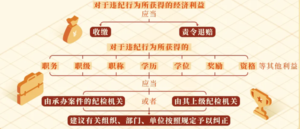 對(duì)于違紀(jì)行為所獲得的職務(wù)、職級(jí)、職稱、學(xué)歷、學(xué)位、獎(jiǎng)勵(lì)、資格等其他利益,應(yīng)當(dāng)由承辦案件的紀(jì)檢機(jī)關(guān)或者由其上級(jí)紀(jì)檢機(jī)關(guān)建議有關(guān)組織、部門、單位按照規(guī)定予以糾正。