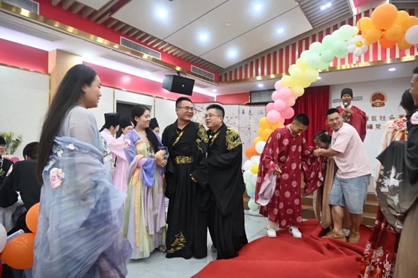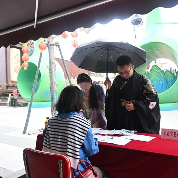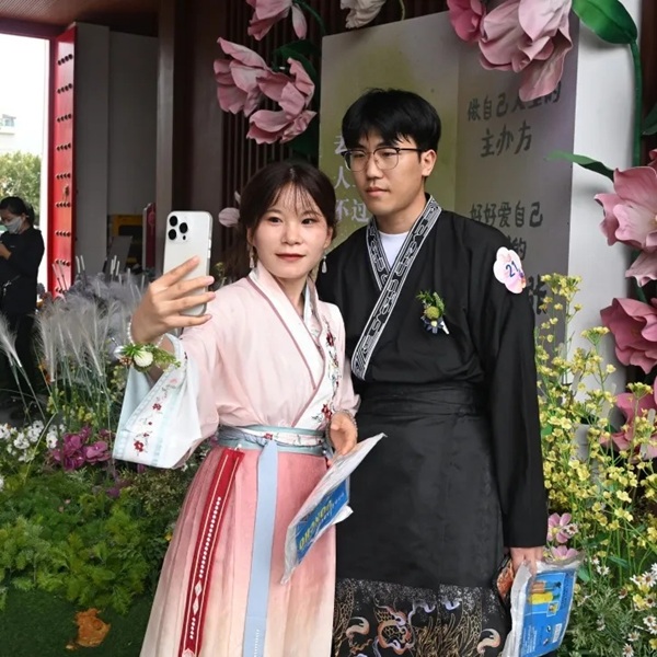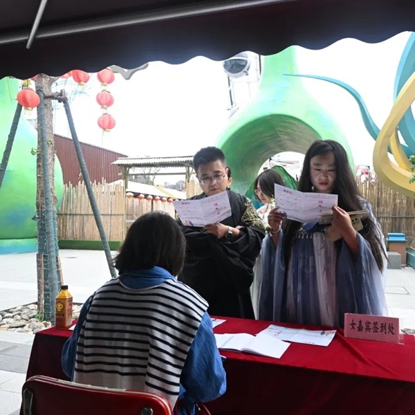 活動(dòng)伊始,身著典雅漢服的青年男女在花月薈主入口簽到,領(lǐng)取專屬胸針與手環(huán),于古韻氛圍中沉浸式感受傳統(tǒng)文化魅力。在隨后的游園定向挑戰(zhàn)環(huán)節(jié),男女嘉賓在繽紛花海中合影留念,協(xié)力完成“終極考官”設(shè)定的趣味任務(wù);高潮迭起的“喜從天降拋繡球”點(diǎn)燃全場(chǎng)熱情,成功搶得繡球的嘉賓組成“繡球CP”;在小劇場(chǎng)二樓,“愛情實(shí)驗(yàn)室”趣味游戲輪番上演,“桃花朵朵開”“蒙眼遞西瓜”……現(xiàn)場(chǎng)氣氛溫馨融洽。在主持人的鼓勵(lì)下,多位嘉賓勇敢表達(dá)心意,最終公司5名單身青年成功牽手,收獲全場(chǎng)熱烈掌聲與美好祝福。